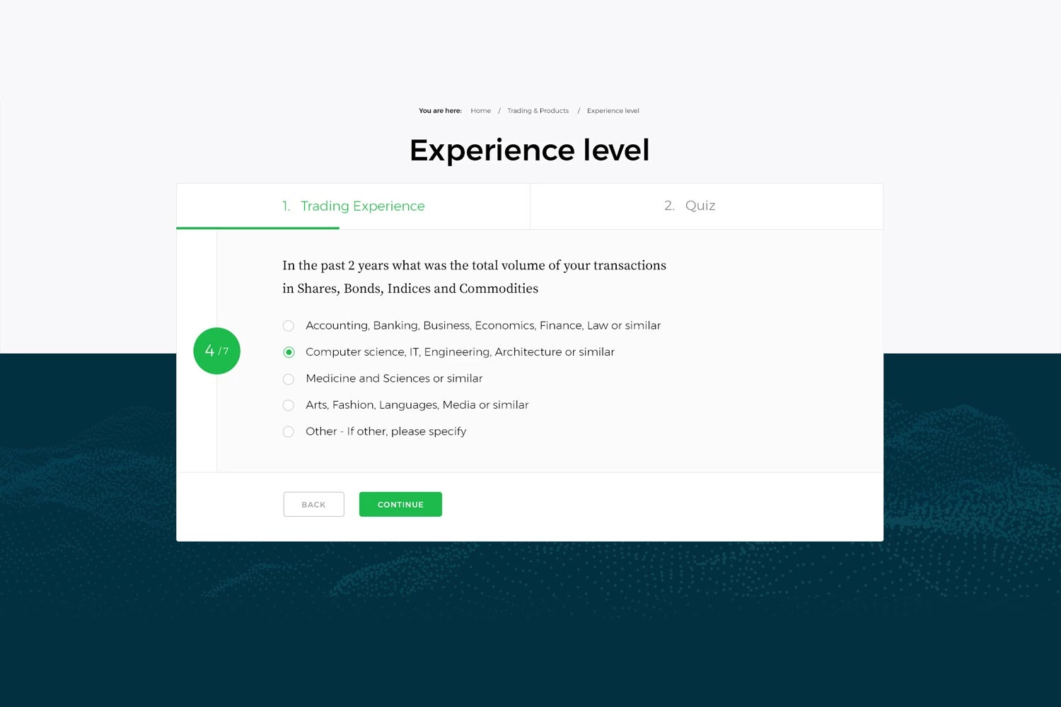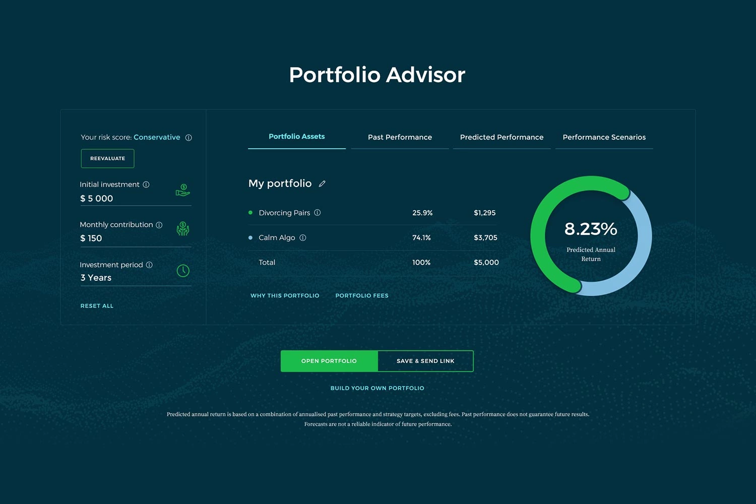 Пользователь может определить свой опыт инвестирования и получить рекомендации об инвестиционных стратегиях на основе коротого опроса.