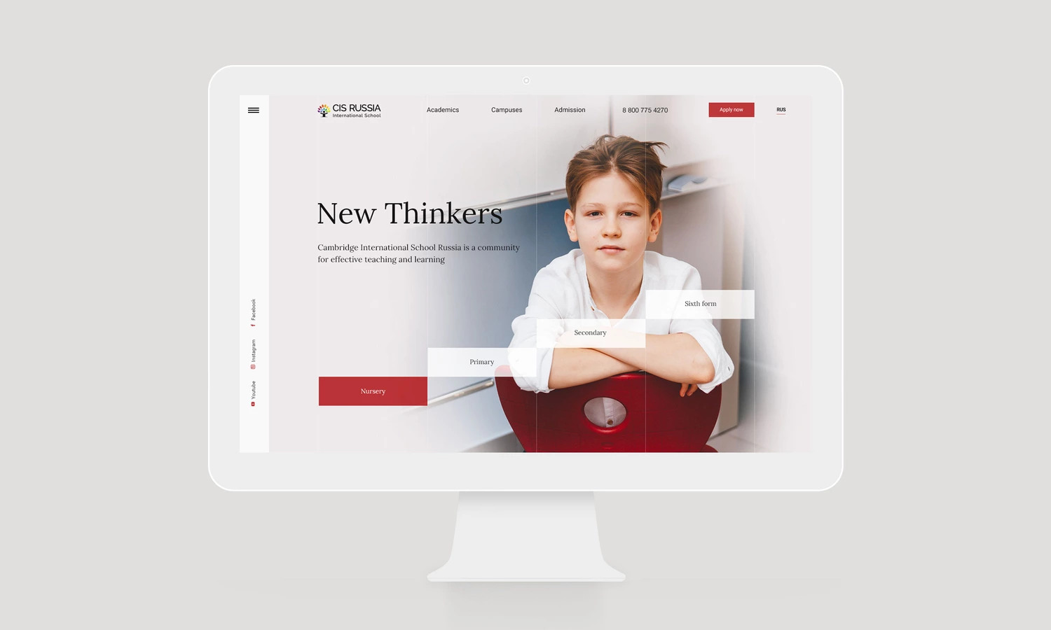 Наше визуальное сообщение нацелено на тех родителей, которым важно, чтобы их дети получили нечто большее, чем просто качественное образование. На первом экране мы показываем современного ребенка, в узнаваемой форме школы — новых граждан мирового сообщества, открытых и восприимчивых к новым идеям и знаниям. А этапы обучения передает символическая лестница, которая ведет детей в будущее.