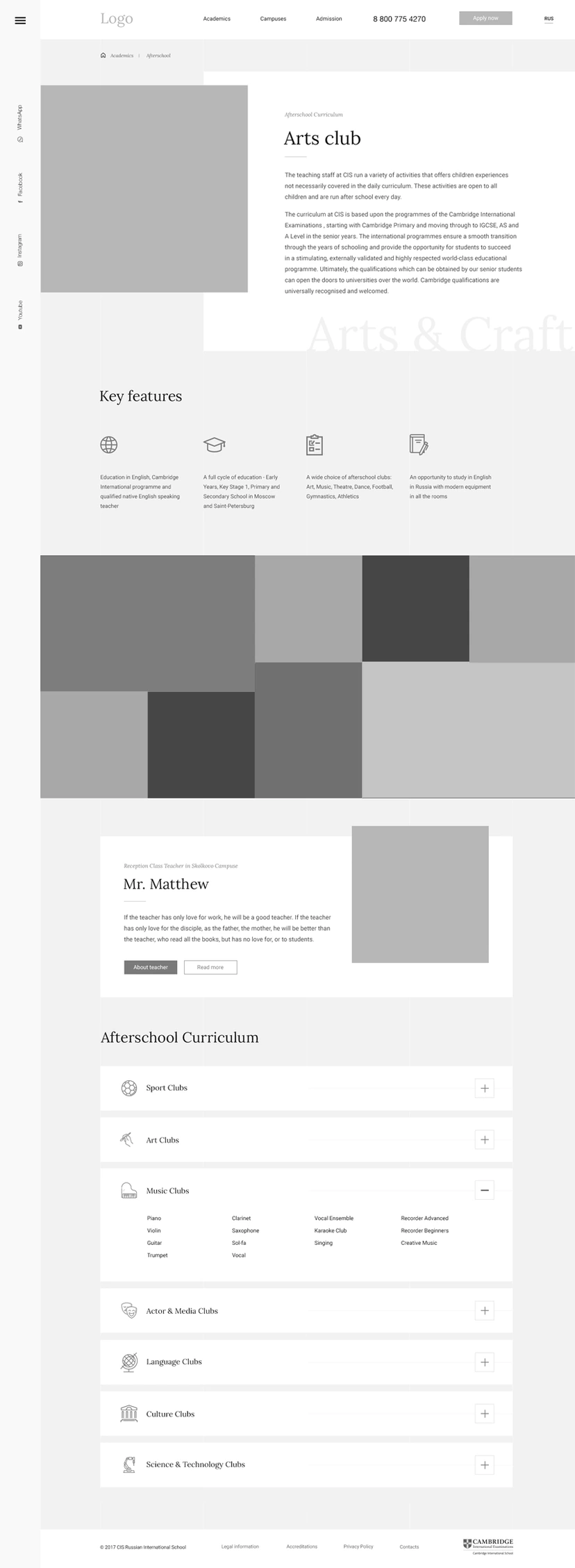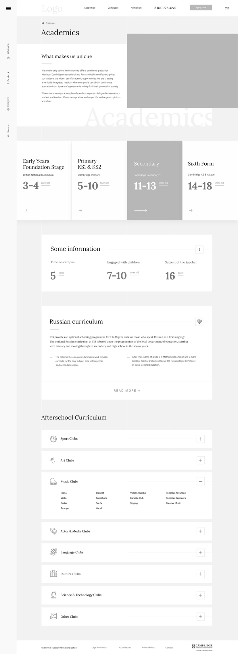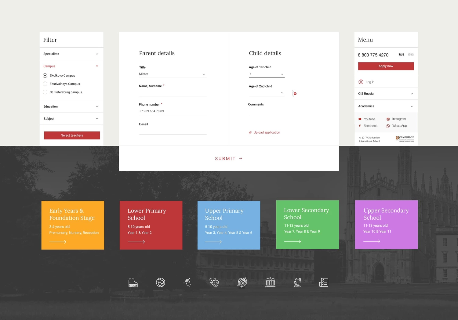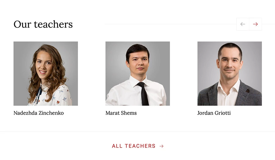 Визуальный язык сайта не случаен. Прежде, чем предложить дизайн, мы изучили отличия в стилистике американских и традиционных английских школ, особенности стиля Кэмбриджа и что делает его узнаваемым. Дизайн, типографика тщательно подобранные редактором изображения отражают узнаваемый академичный стиль.