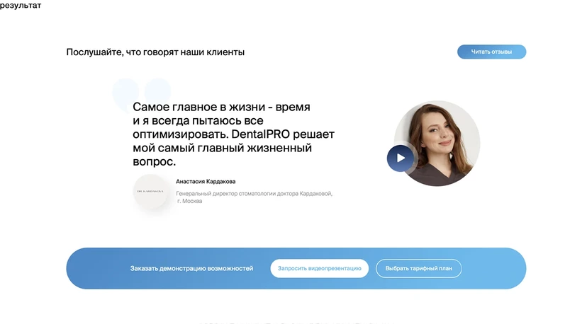 Дополнительно мы внедрили контекстные отзывы — живые кейсы, где реальные пользователи рассказывают, как конкретные модули или возможности продукта помогли их клинике.