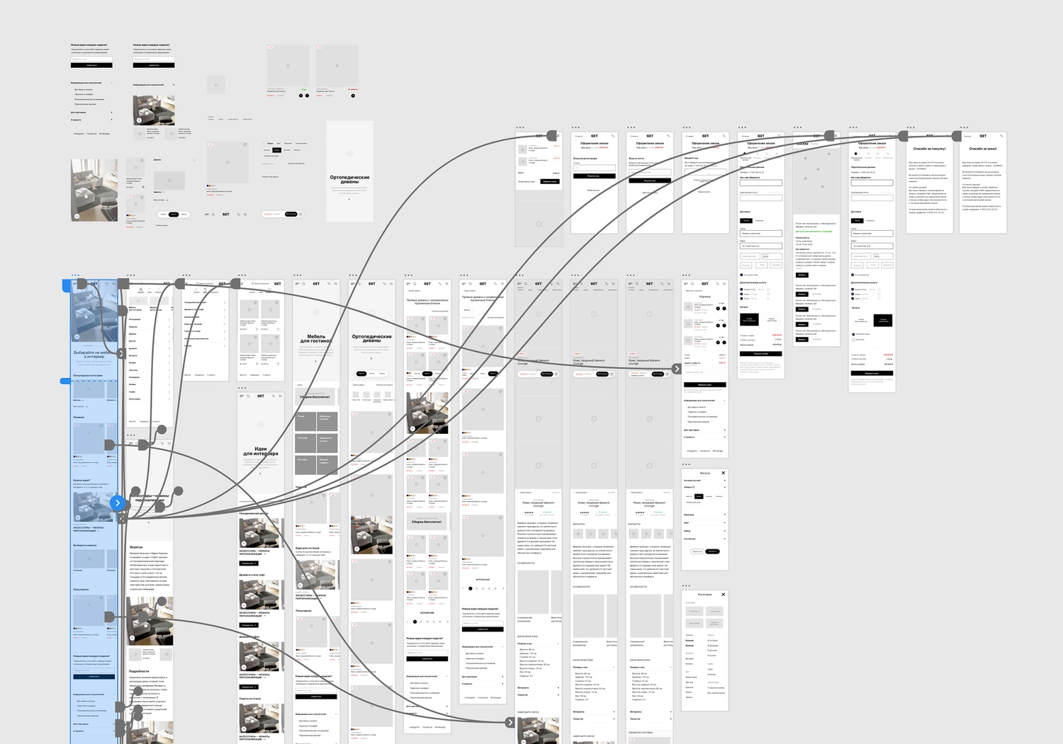 Перед тем, как приступить к UX дизайну проекта, мы сформировали карту функциональных референсов, разобрав 37 наиболее интересных мебельных сайтов, приемов навигации, представления продукта, поиска, сортировки, оформления заказа.