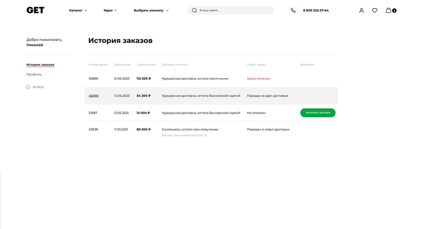 Личный кабинет пользователя построен по механизму, когда он дополняет сервисные функции. В нем можно посмотреть историю заказов, оплатить покупки, узнать состояние заказа.
